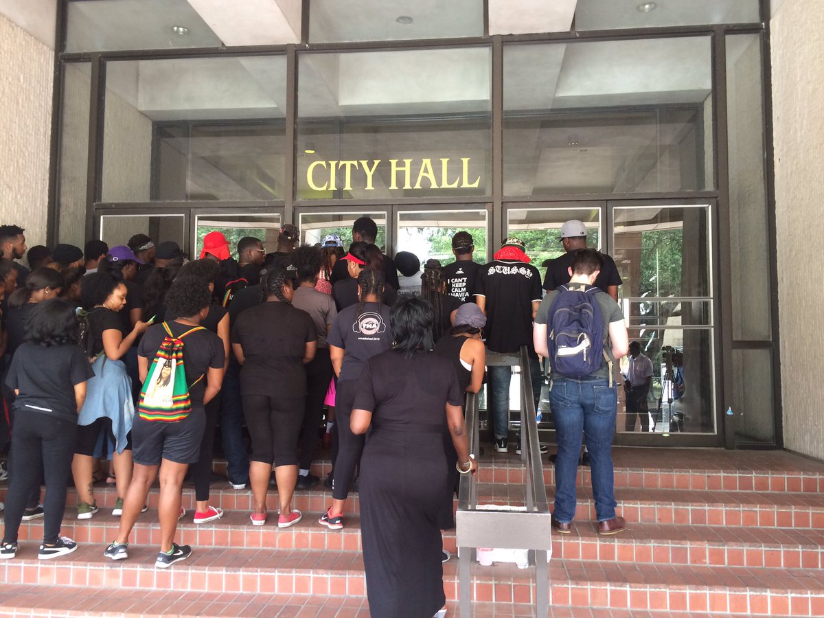 Trouble besieged Baton Rouge City Hall as protesters blocked door; large crowd standing arm-in-arm over the Baton City Hall police shooting of Alton Sterling.
